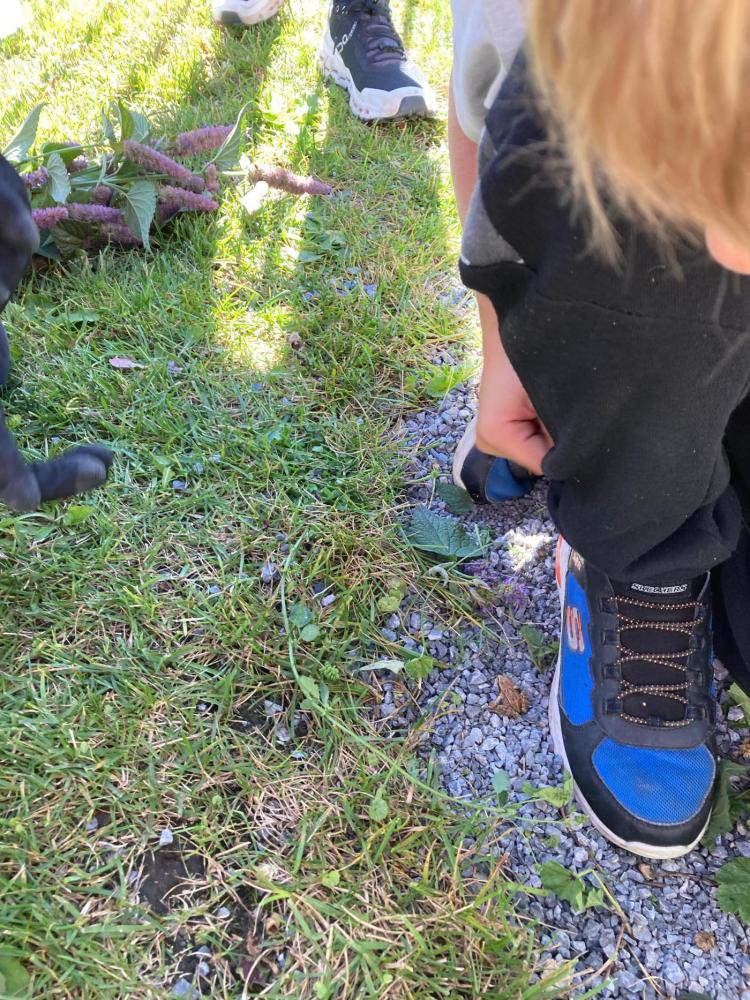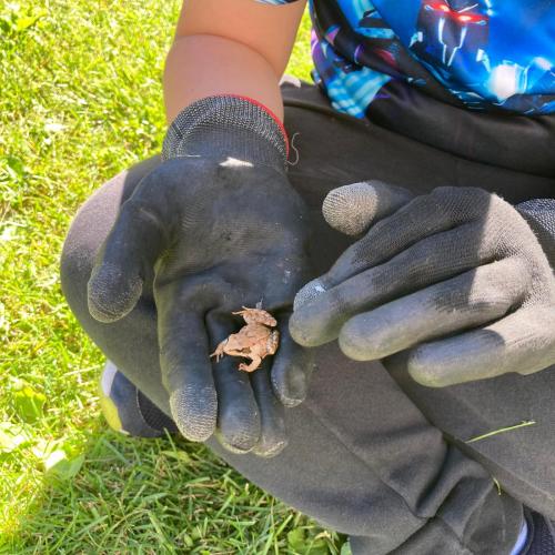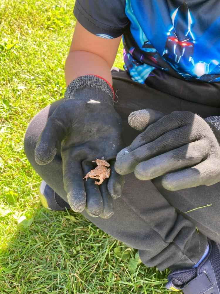 Besuch im Schulgarten von Stefanie Juen 19. September 2025 2025/2026 Naturpark Im Schulgarten haben wir einen Frosch gefunden. Er lebt in der Schmetterlingsspirale. Nach dem Foto haben wir ihn frei gelassen. - Louis