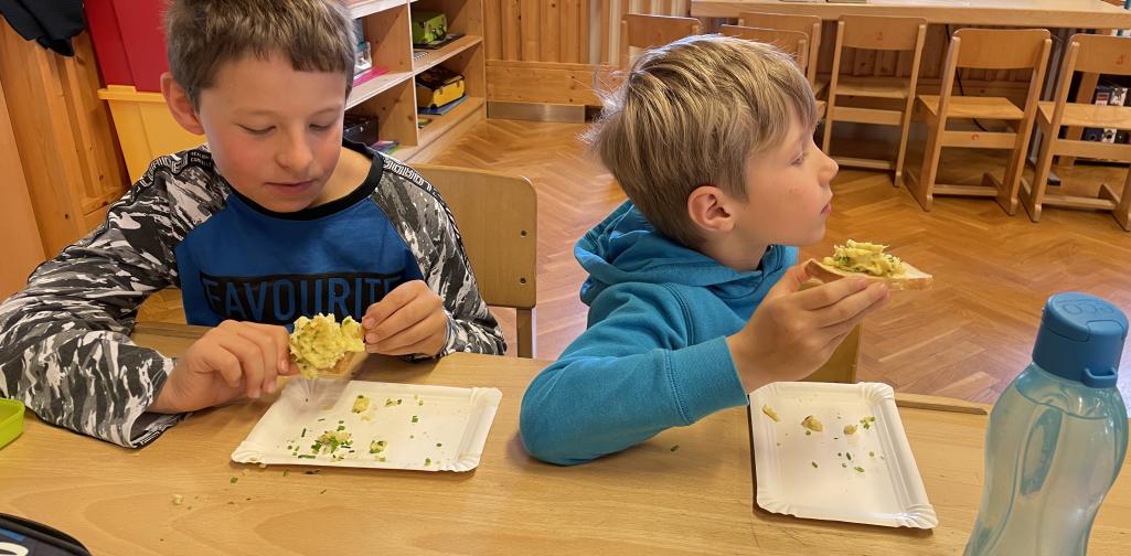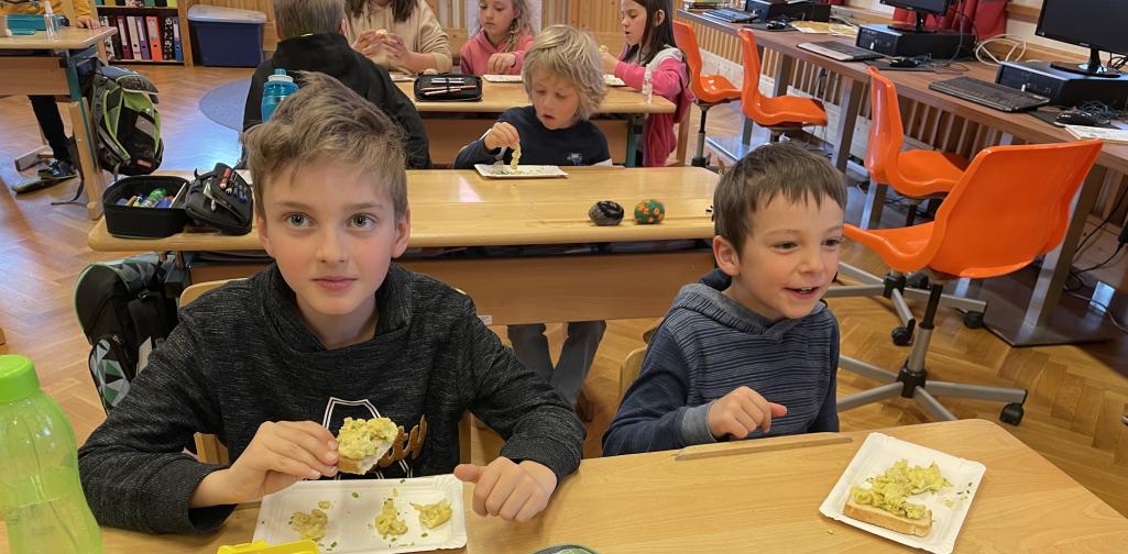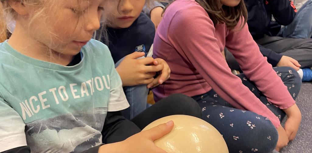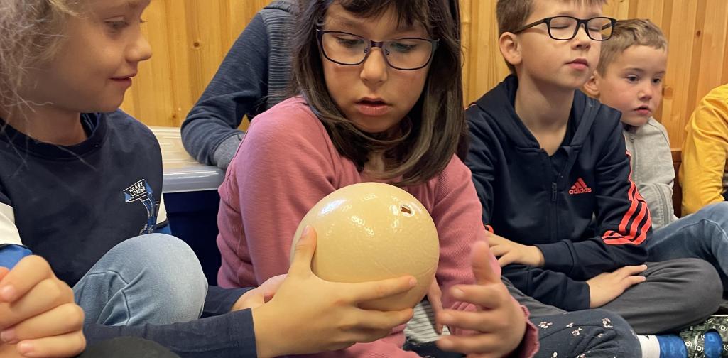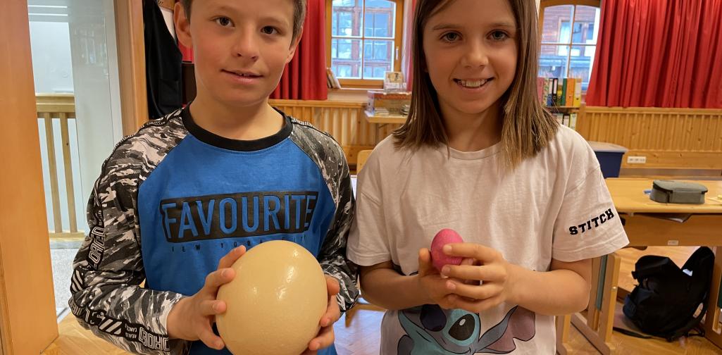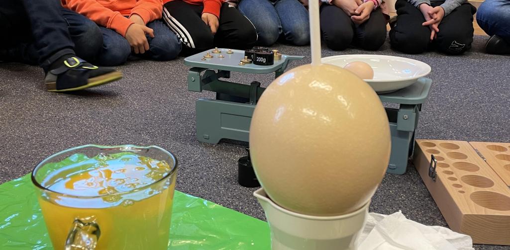 In der Woche vor Ostern beschäftigten sich die Kinder der 2. Klasse im Unterricht mit dem Thema "Ei". Die Schülerinnen und Schüler lernten allerlei interessante Fakten über das Huhn und das Ei kennen. Unter anderem wurden auch verschiedene Arten von Eiern betrachtet und miteinander verglichen. Den Höhepunkt dieser Projektwoche stellte aber sicherlich das Verspeisen des Rühreies aus Straußenei dar, nachdem dieses zuvor gründlich von den Kindern inspiziert wurde.
