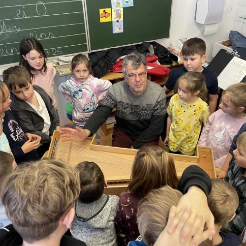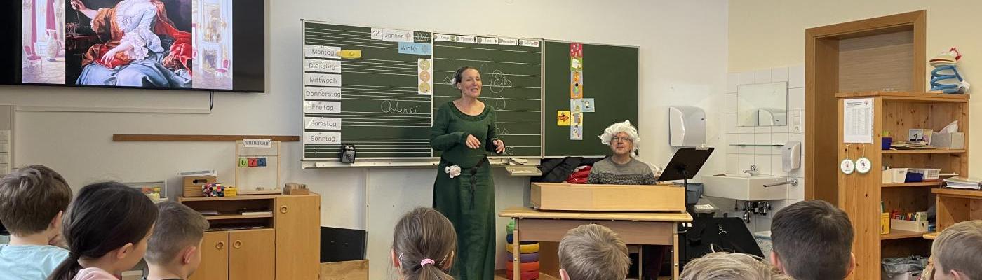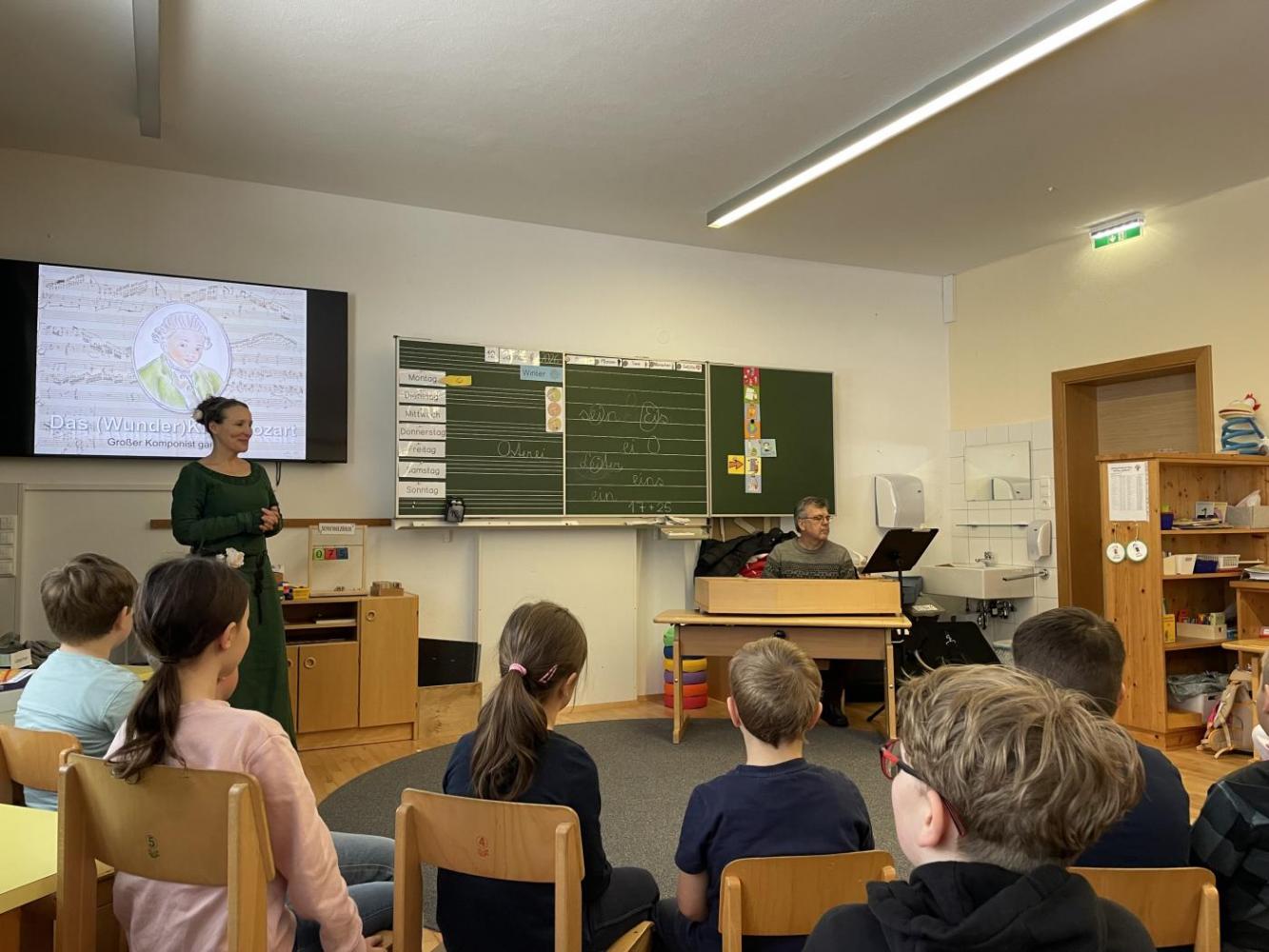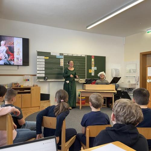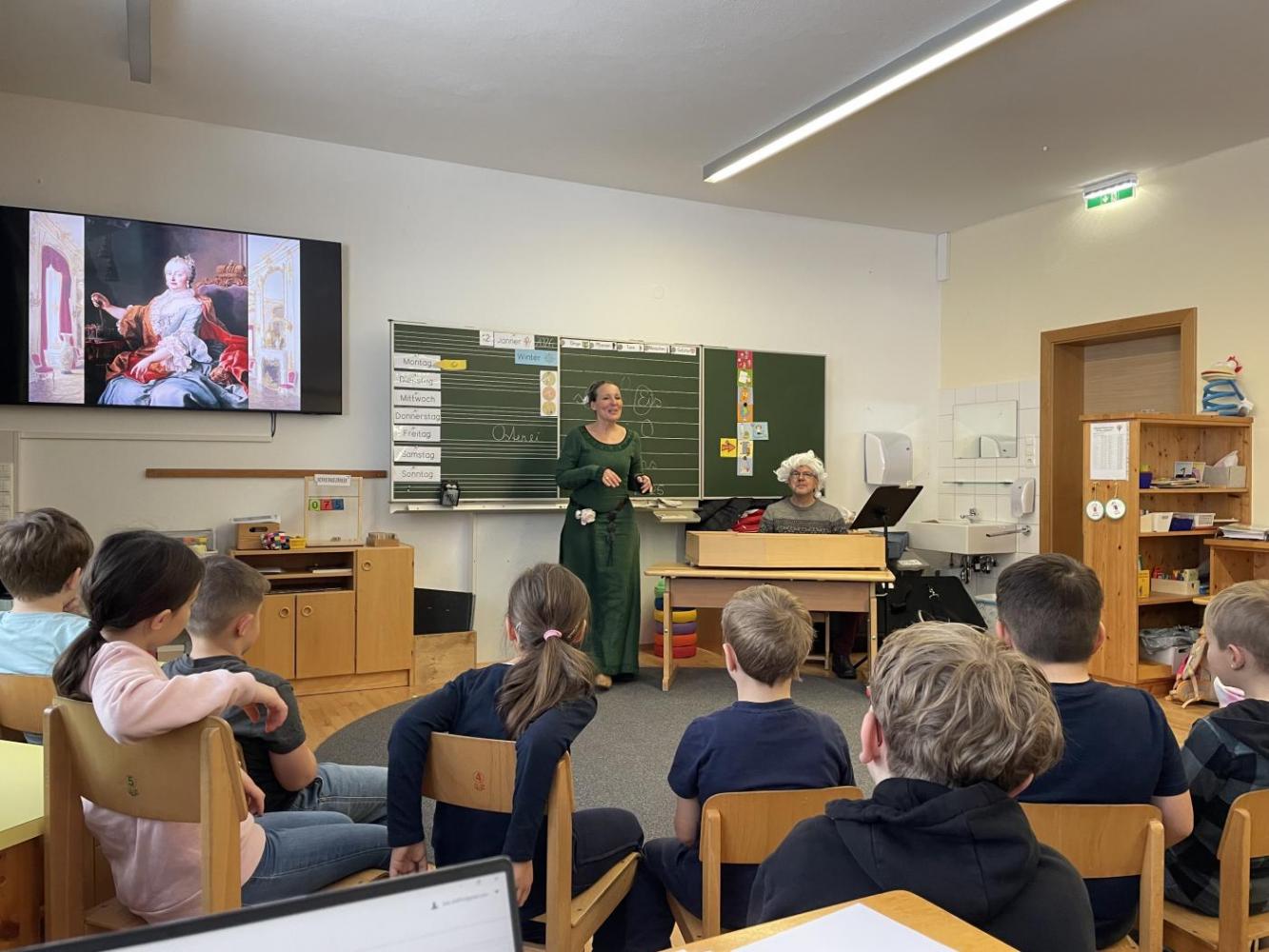 Schon mit sechs Jahren komponierte Mozart sein erstes Werk. Doch wie lebte der kleine Mozart, welche lustigen Geschichten aus seinem Leben sind bekannt und welche Instrumente spielte das Wunderkind? All diesen Fragen wurde auf anschauliche und kindgerechte Weise nachgegangen. Umrahmt von Musikstücken, die Mozart bereits als Kind geschrieben hatte, und begleitet von Bildern, konnten die Kinder mit Ohren und Augen die frühen Jahre des berühmten Komponisten erleben. Besonders spannend war, dass die Kulturschaffenden ein Spinett, also ein kleines Cembalo, mitgebracht hatten.