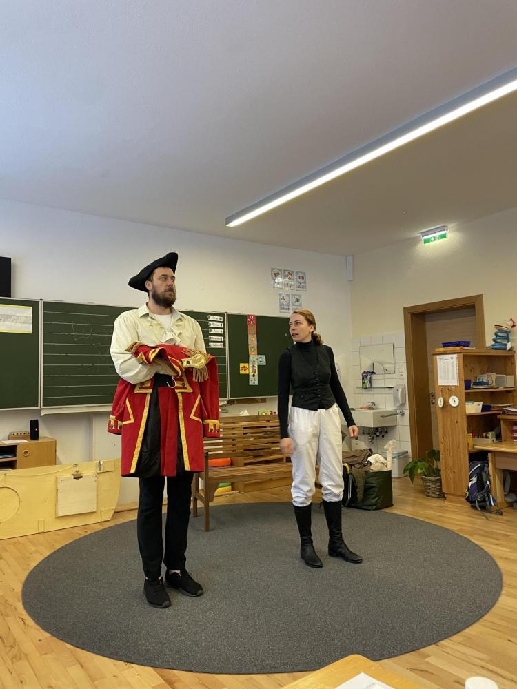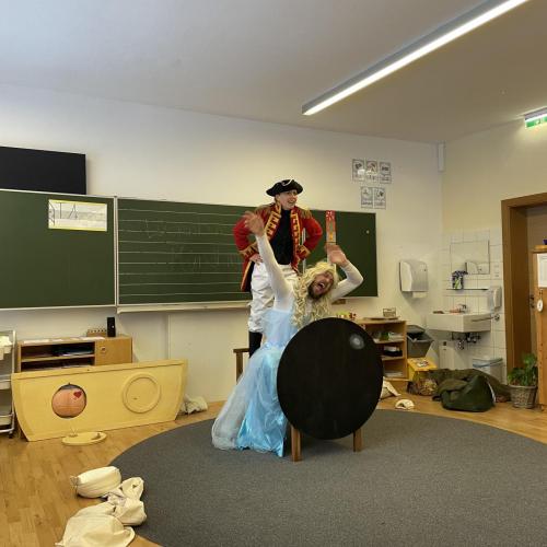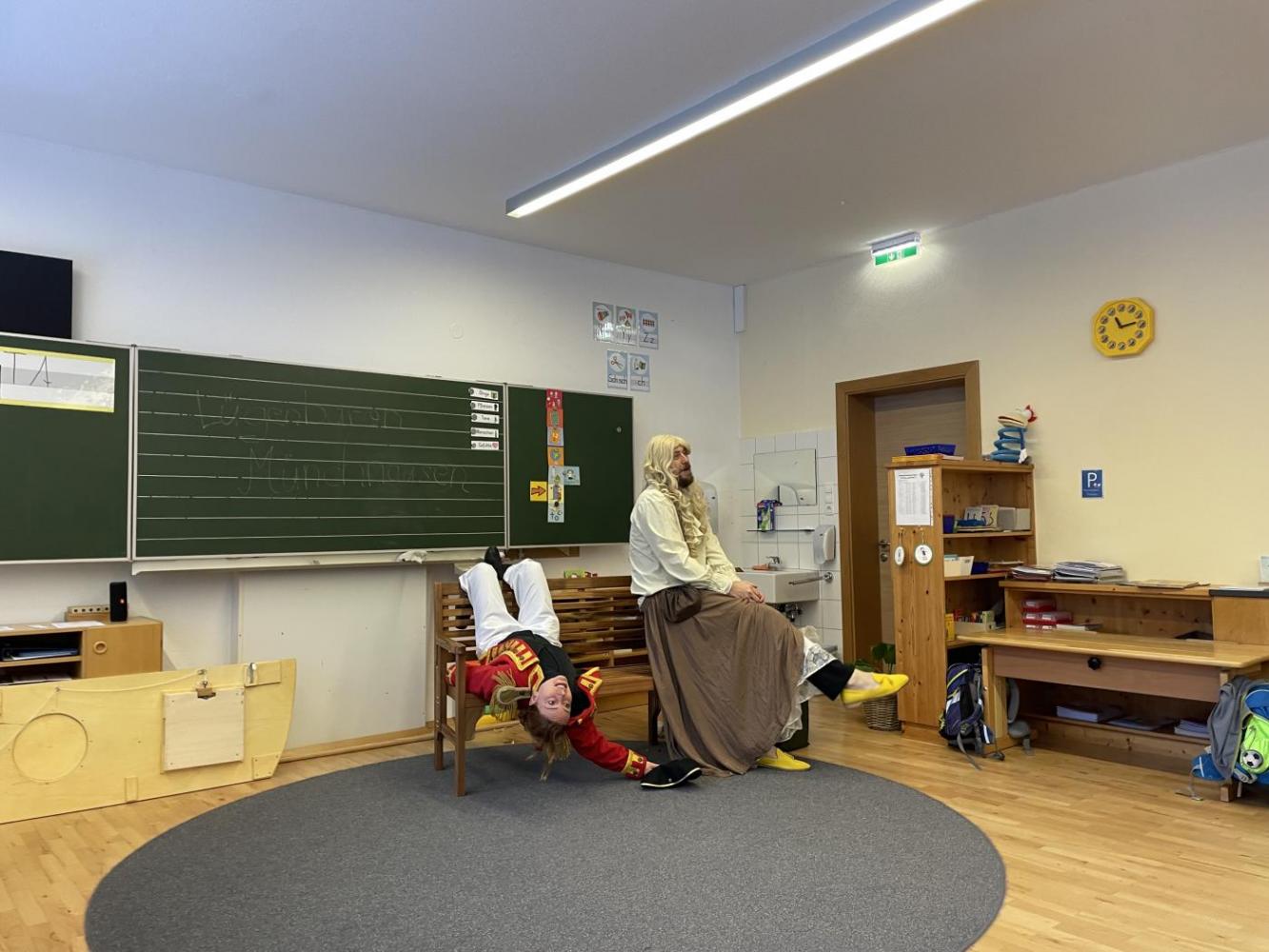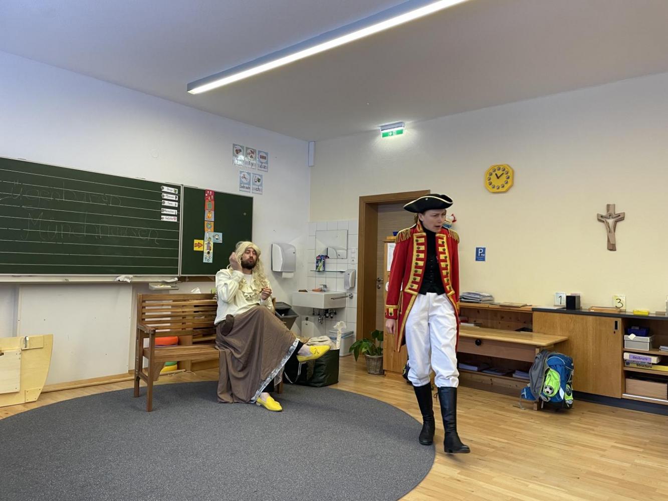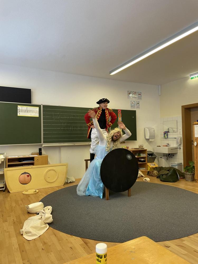 Eigentlich sollte das Stück gleich beginnen – doch dann stellte sich heraus, dass Gregor den Text vom falschen Stück gelernt hatte: Aschenputtel! Kurzerhand schlüpfte Karoline in die Rolle des Lügenbarons Münchhausen, während Gregor als „Cinderella“ auf der Bühne stand. Das sorgte für viele lustige Momente und großes Gelächter im Publikum.
