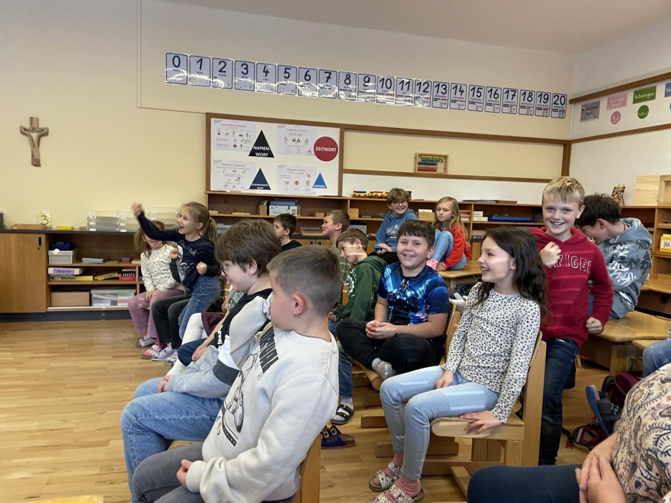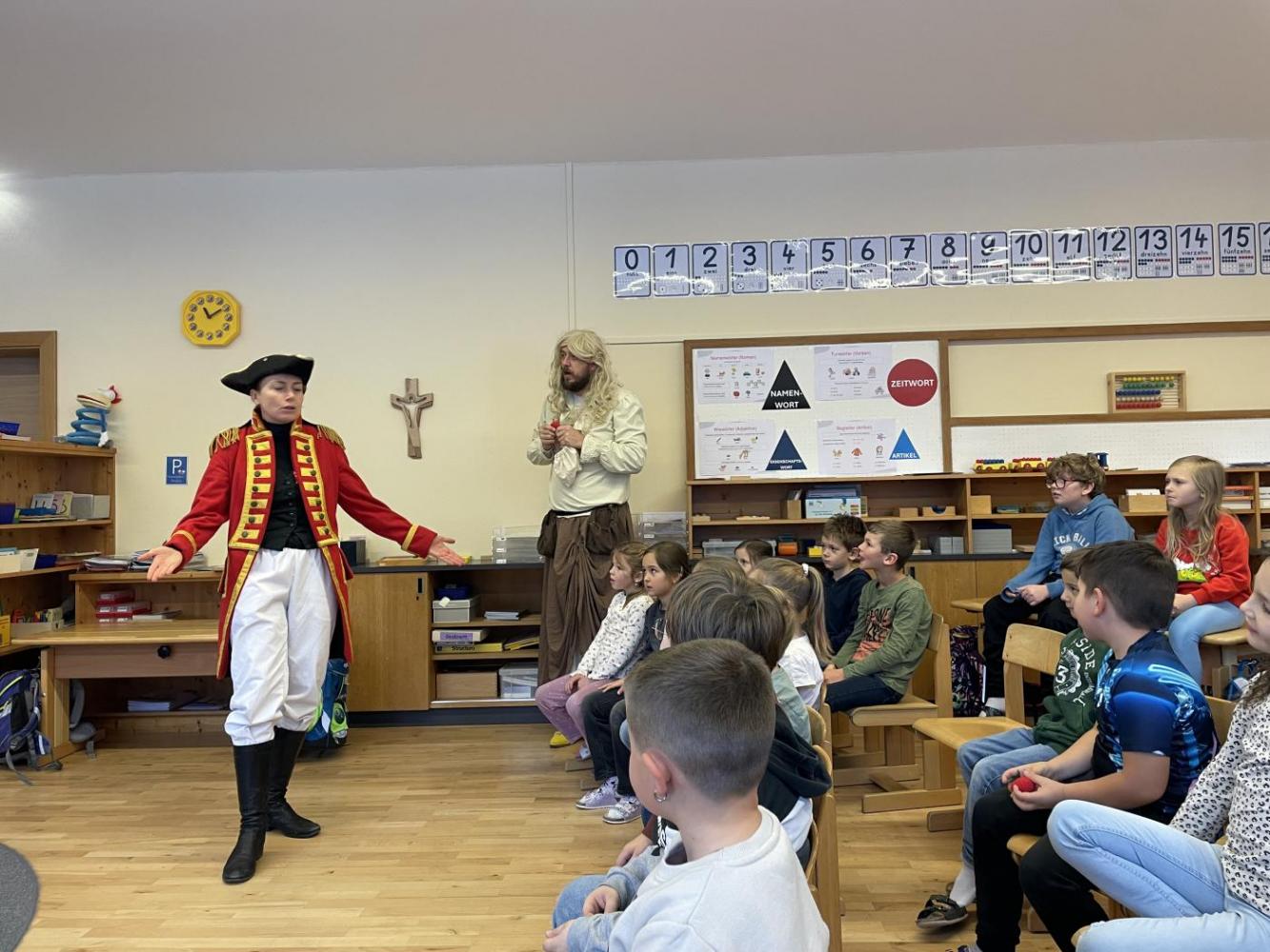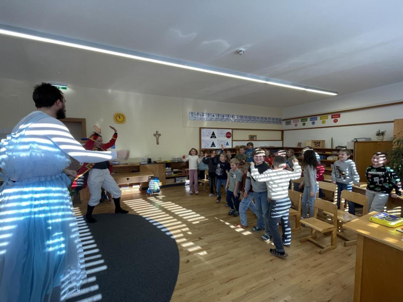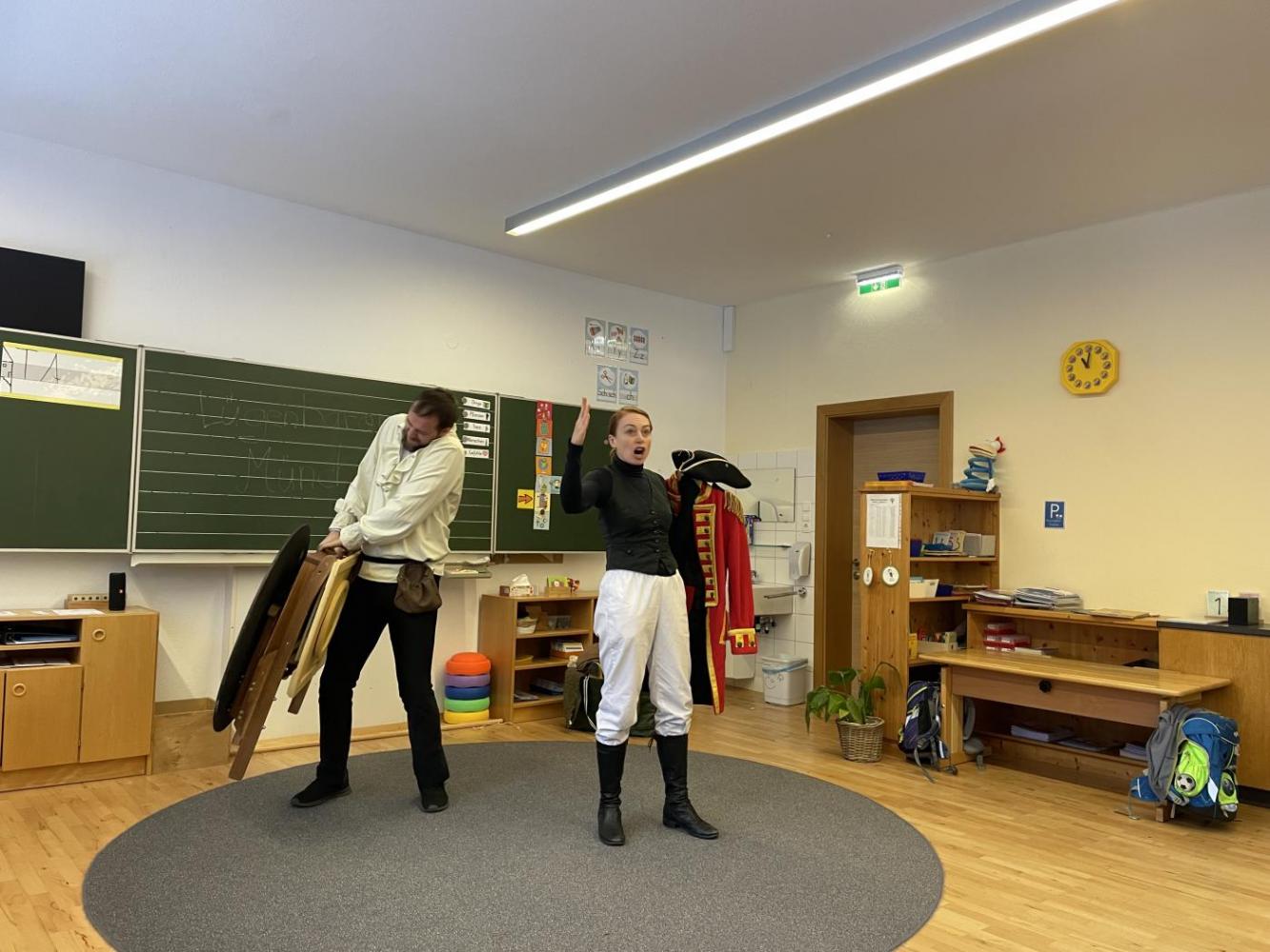 Eigentlich sollte das Stück gleich beginnen – doch dann stellte sich heraus, dass Gregor den Text vom falschen Stück gelernt hatte: Aschenputtel! Kurzerhand schlüpfte Karoline in die Rolle des Lügenbarons Münchhausen, während Gregor als „Cinderella“ auf der Bühne stand. Das sorgte für viele lustige Momente und großes Gelächter im Publikum.
